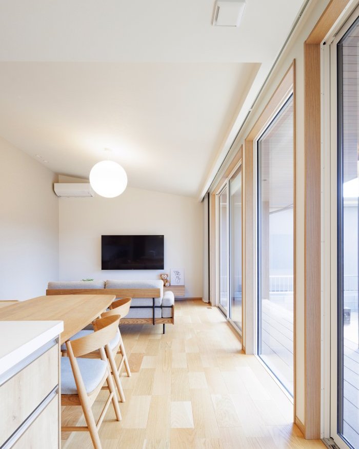 キッチンに立ったときの開放感を重視され、大開口の窓を採用されました。キッチンとリビングにはそれぞれ引違いの窓を、その間にはFIX窓(開閉できない窓)を取り付けています。軒天と窓の高さを揃え、さらに下枠に段差のないノンレールサッシを採用されているので、室内から外部への繋がりを感じられ、視線が気持ちよく抜けていきます。